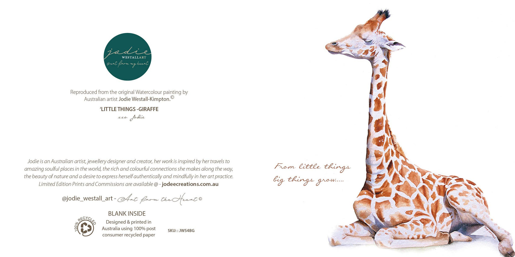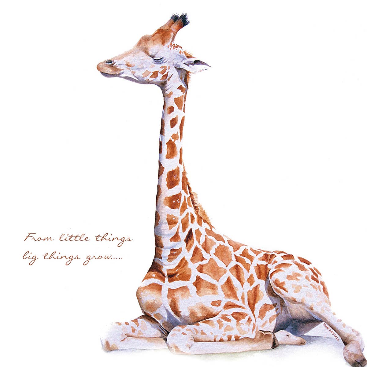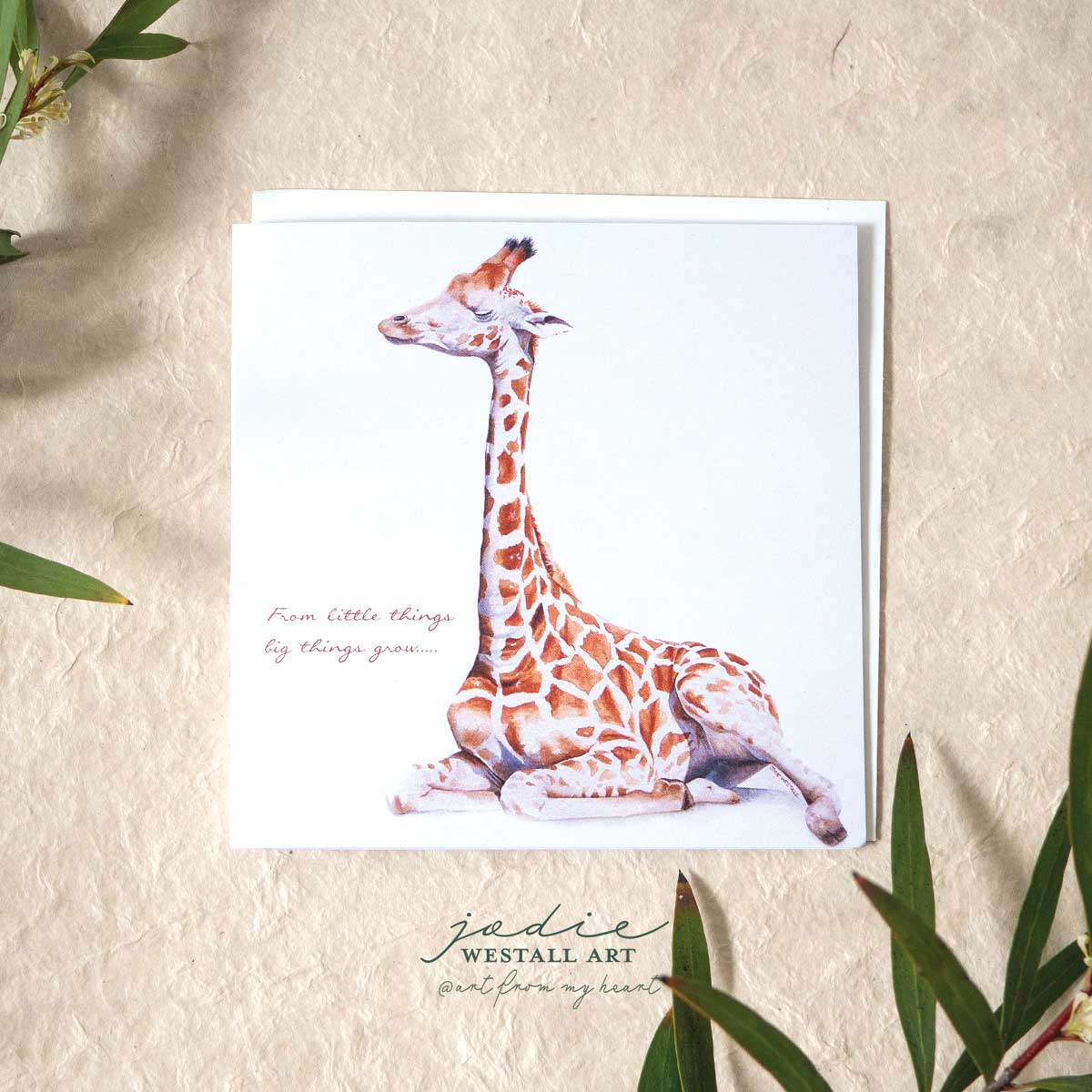 Inspirational, Birthday, Cute Baby Card. ‘Baby Giraffe’ is from the original Watercolour Painting by Artist Jodie Westall. WORDING ON FRONT: It is with brave wings we fly.  BLANK inside - Designed and printed in Australia on 100% recycled paper, using vegetable inks.