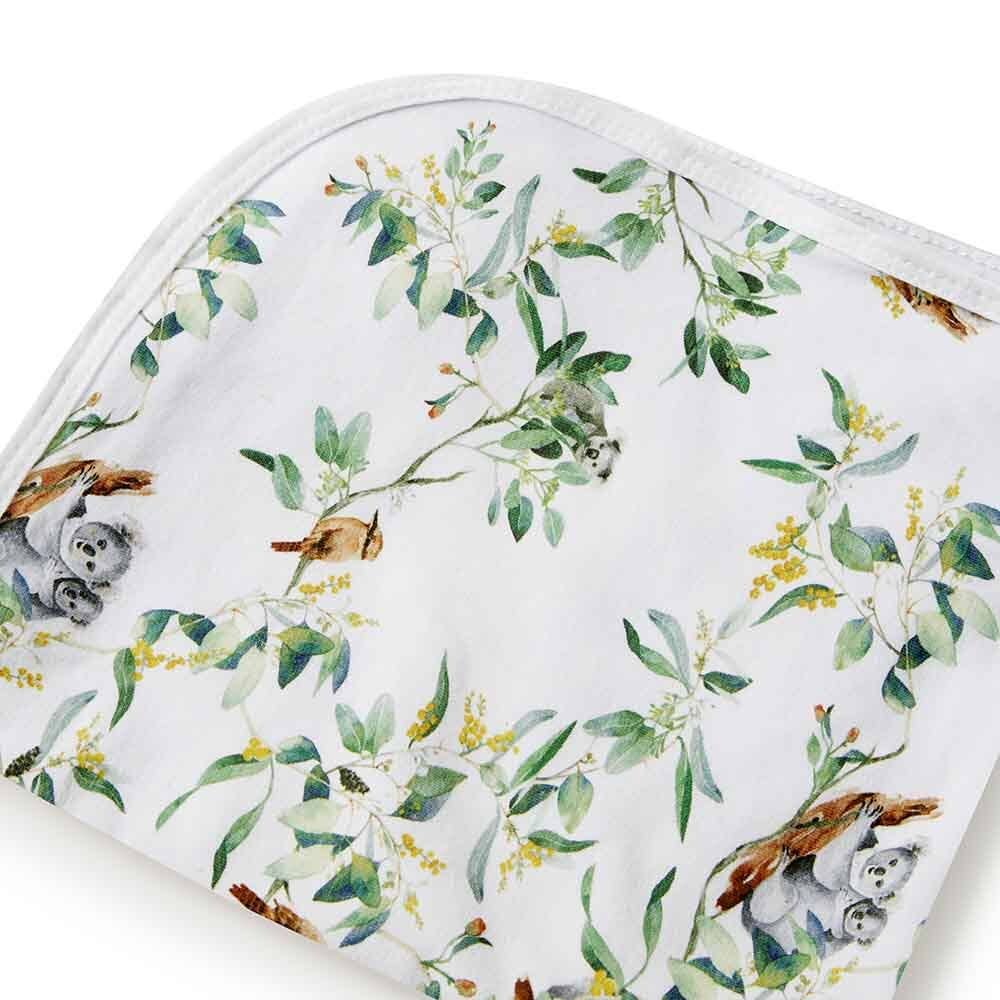 Our Snuggle Hunny cotton jersey wrap with matching beanie is soft, snuggly and stretches with baby. This wrap features our Snuggle Hunny Eucalypt design.