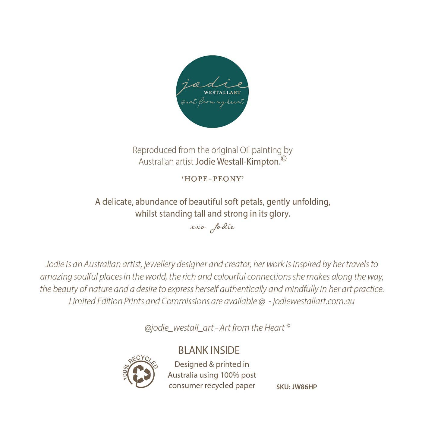 Everyday Greeting card 'Hope Peony’ is from the original Oil Painting by Yarra Valley Artist Jodie Westall.  BLANK inside - Designed and printed in Australia on 100% recycled paper, using vegetable inks.