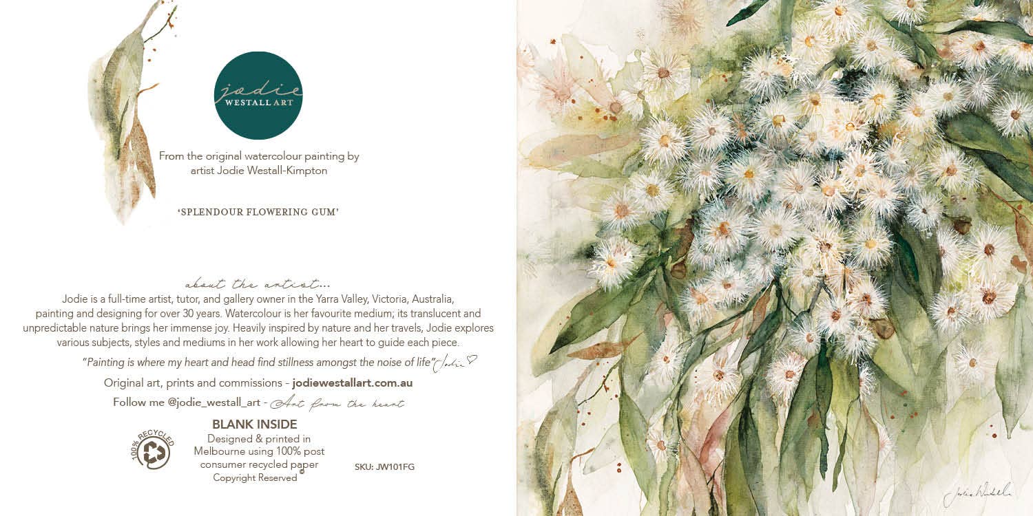 All-purpose Card. 'Splendour flowering gum’ is from the original Painting by Artist Jodie Westall.  BLANK inside - Designed and printed in Australia on 100% recycled paper, using vegetable inks.